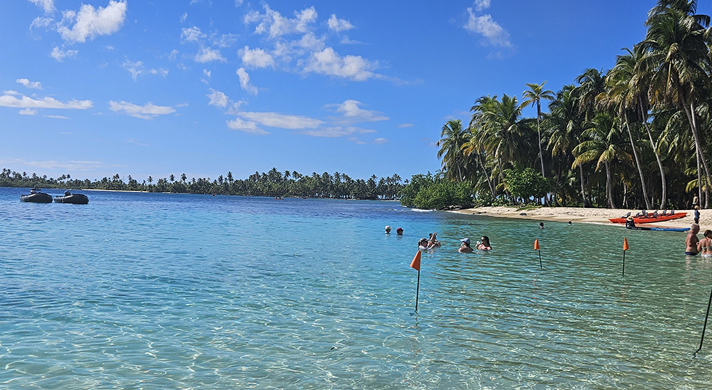 Naturally, the itinerary is often the key when booking a cruise and we all have bucket list destinations. Sometimes, it’s a getaway moment, and many on our sailing wanted to transit the Panama Canal – which was a lovely and fascinating day. On our itinerary, we happily immersed ourselves in the flora and fauna of islands we had barely heard about. We splashed and snorkelled and swam to our hearts’ content, and on one memorable day, we had the best beach party on the most beautiful slice of paradise you could imagine. This was in the San Blas Islands, home to the Guna Indians, who kindly let us come to their island, interact with their people and then frolic in the water with some of the local children. We had so much fun and also enjoyed some fantastic snorkelling. A highlight was doing “aquabics” in the clear, azure water, with Richard wading into the sea in his uniform to bring us Champagne (in plastic glasses), and our delightful Captain Torry joining the shenanigans in the water. These are the days of laughter and memories.