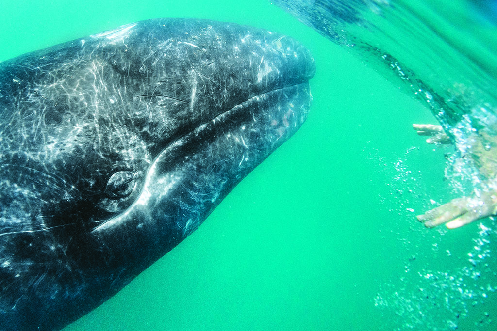 On a traditional whale watching excursion, you hope to see a blowhole or two, maybe catch a glimpse of a tail. But you don’t expect to see several sleek gray backs skimming the water right in front of you. And surely you don’t expect to touch a gray whale.