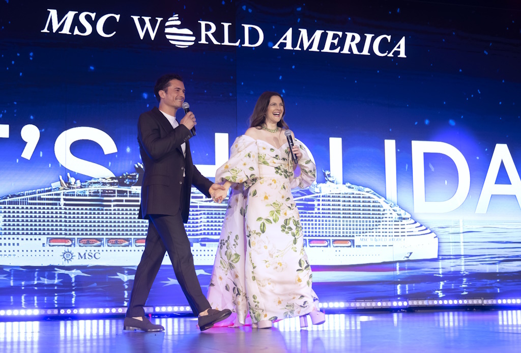 DREW BARRYMORE AND ORLANDO BLOOM CREDIT ANTHONY DEVLIN, GETTY IMAGES FOR MSC CRUISE