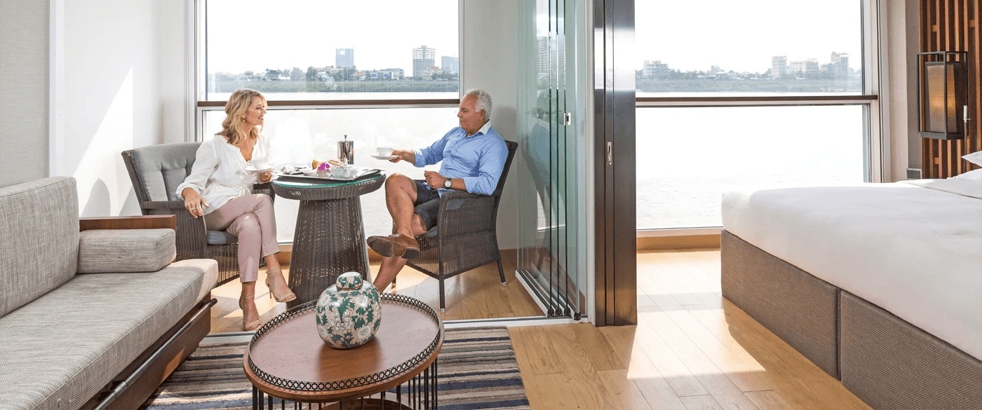 Scenic Spirit has the largest lead-in suites on the Mekong, from 344 sq. ft. and designed with unrivalled attention to detail. Think of your suite as your sanctuary on the river, with a separate bedroom, living room, a walk-in wardrobe, a spacious bathroom, and balcony, with an exclusive Sun Lounge to relax and indulge in maximum comfort. Nightly turndown service, complimentary mini bar, and a pillow menu are all part of the experience. Each suite also features a custom ergonomic Slumber Bed which ensures you wake up refreshed every day.