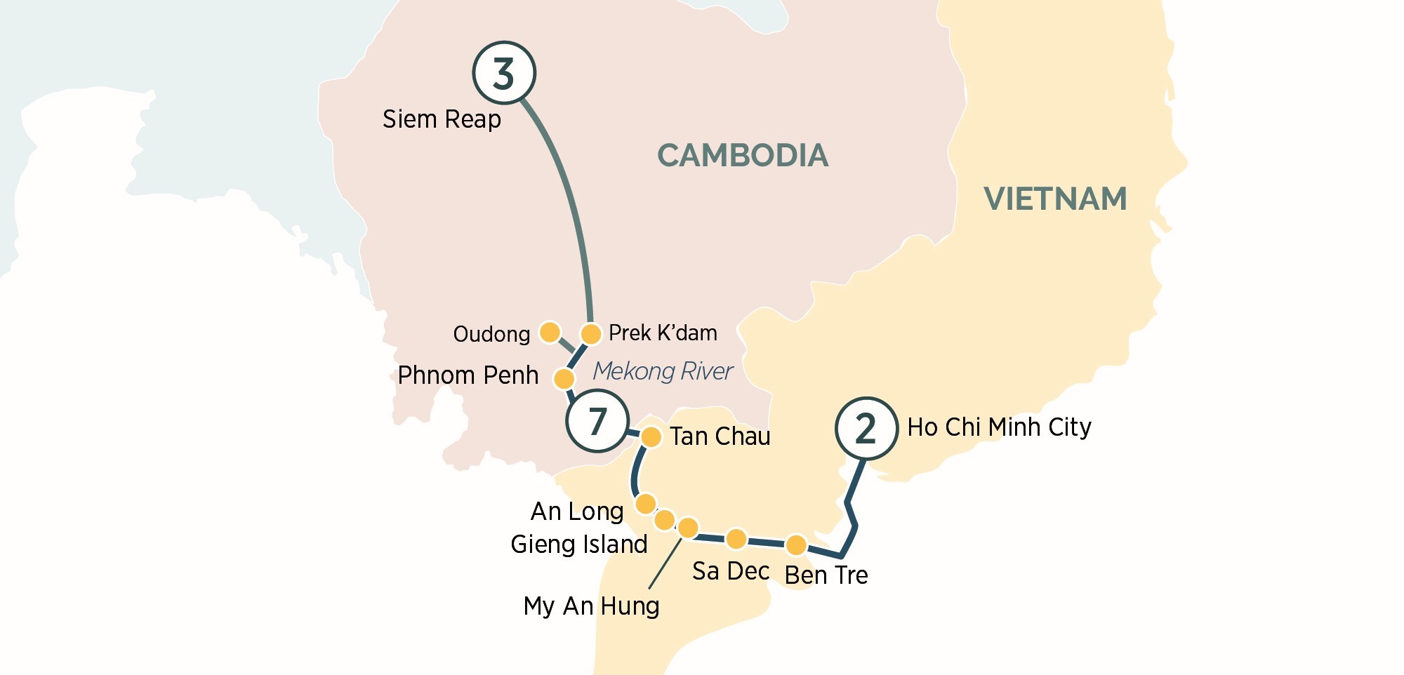 Enjoy visits to popular Vietnamese and Cambodian sites as well as traditional performances on board and ashore. In Ben Tre (Day 4), join Chef Chanthy Yen for a cocktail reception on board. On Day 7, spend the afternoon with Chef Yen as he hosts a cooking demonstration, and celebrate your final evening with a special farewell dinner crafted by Chef Chanthy, inspired by the authentic flavours of his Cambodian heritage.