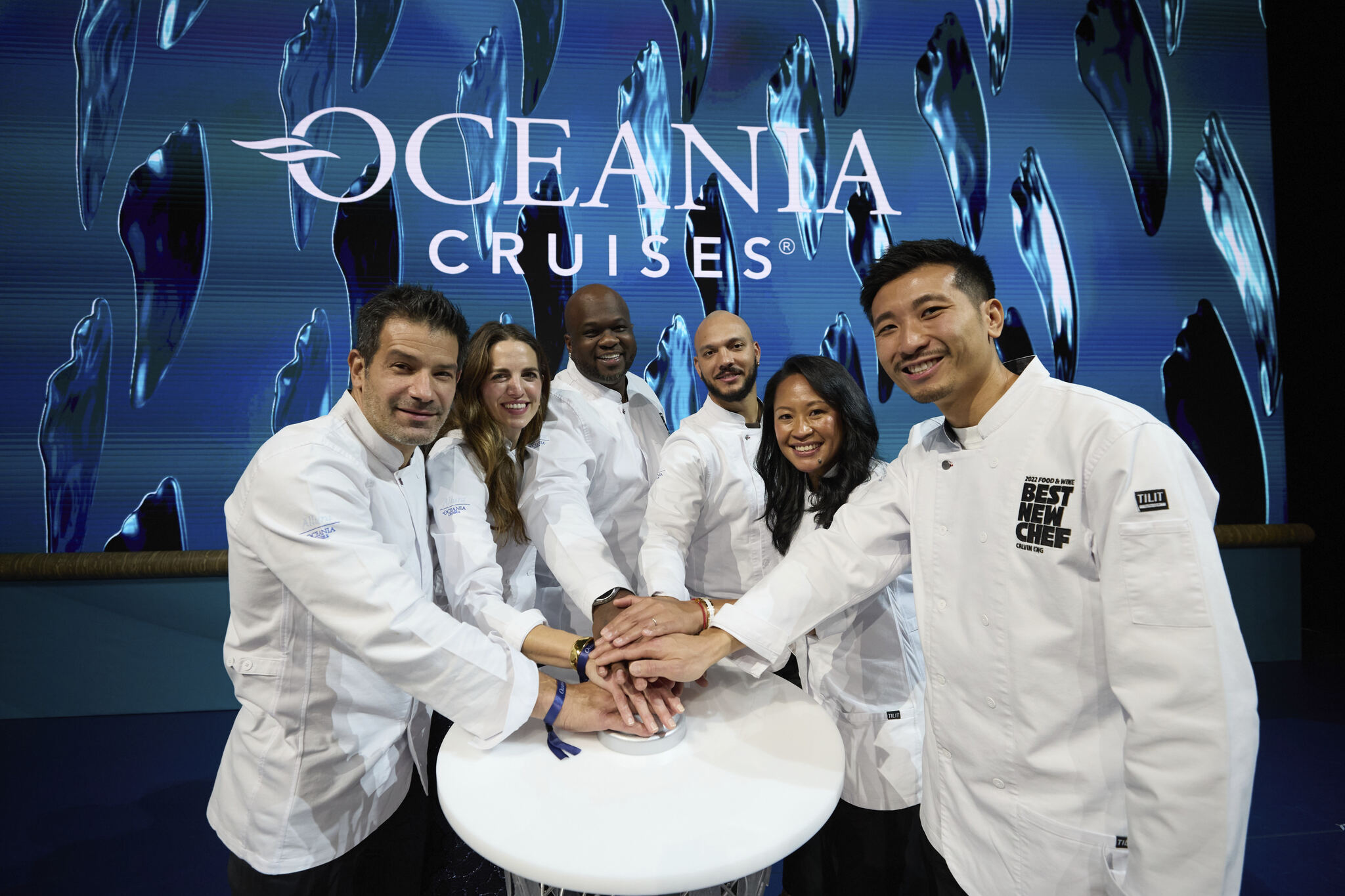 Acclaimed chefs Tavel Bristol-Joseph, Katie Button, Calvin Eng, Aisha Ibrahim, George Mendes and Lawrence "LT" Smith had the honor of representing the prestigious Food & Wine Best New Chefs franchise as godparents during the christening ceremony with the time-honored tradition of breaking a Champagne bottle across the ship’s bow, bestowing good fortune on Oceania Allura and all who sail aboard her.